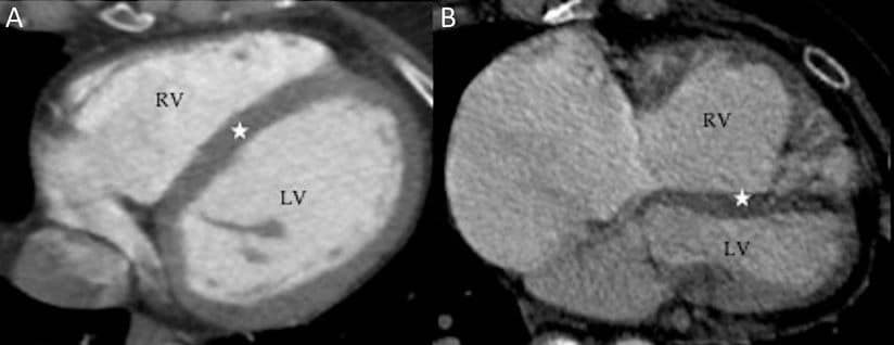 Right: RV dilatation and hypertrophy compressing the LV, creating “clockwise” rotation of the heart