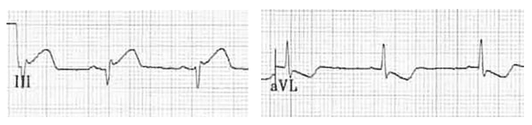 - Reciprocal ST depression and T wave inversion in aVL follows a normal QRS complex, with a wide QRS-T wave angle
