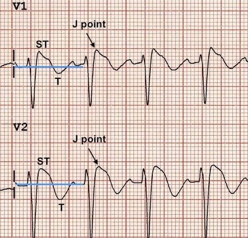 - ST elevation at the J point > 2mm with a “coved” morphology — the ST segment slopes diagonally downwards from the J point, with a slight upward convexity best appreciated in V2