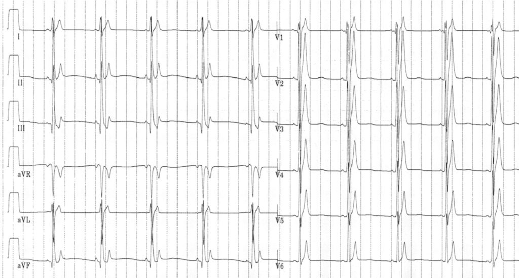 - Short, or absent, ST segments