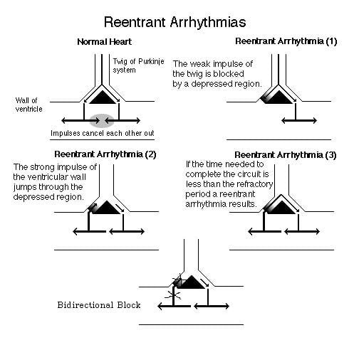- Strong ventricular impulses from the normal/slowed pathway can re-enter the blocked region (2), creating a re-entry circuit (3)