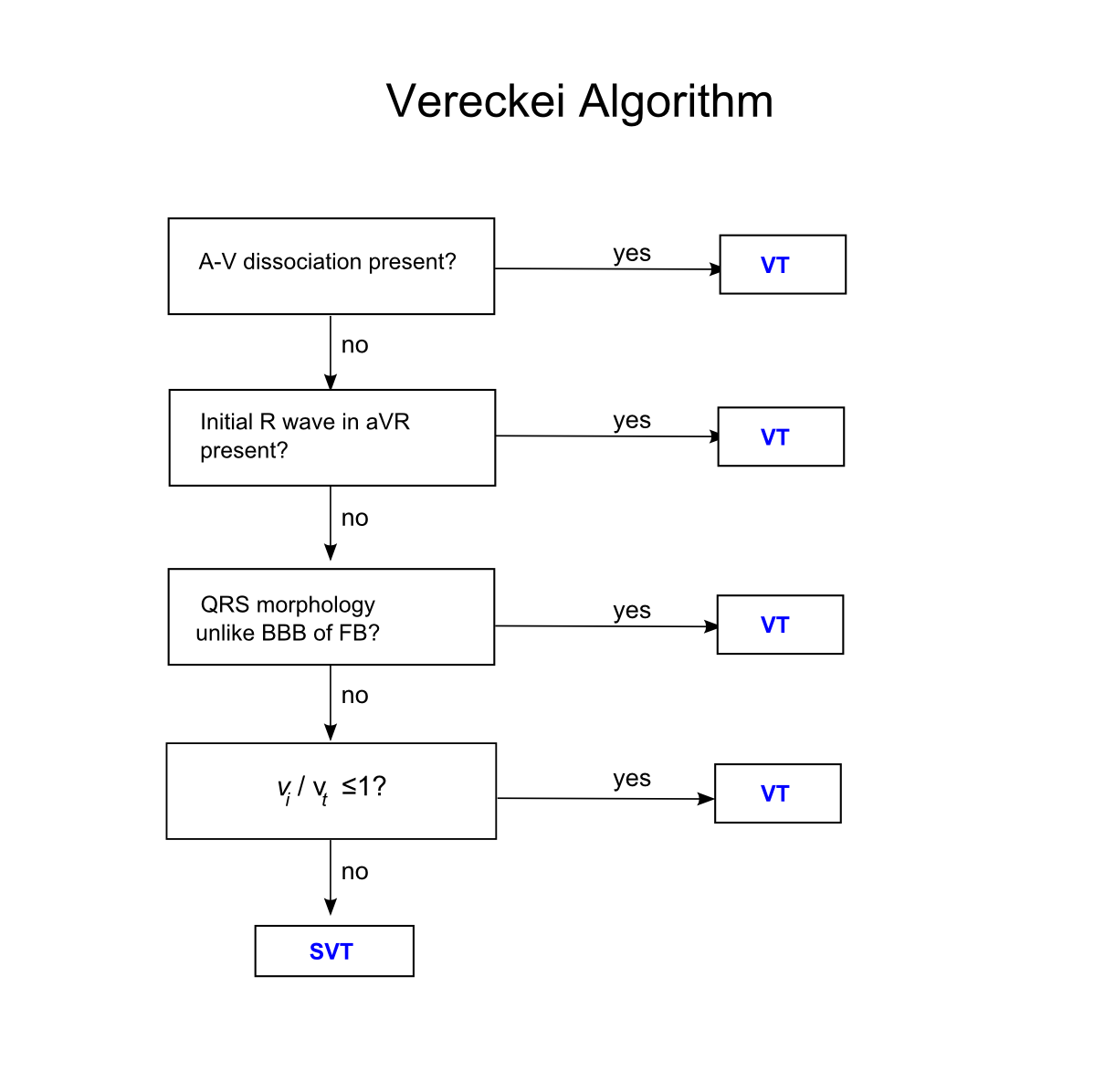 - The algorithm is followed from top to bottom — if any of the criteria are satisfied, then VT is diagnosed.